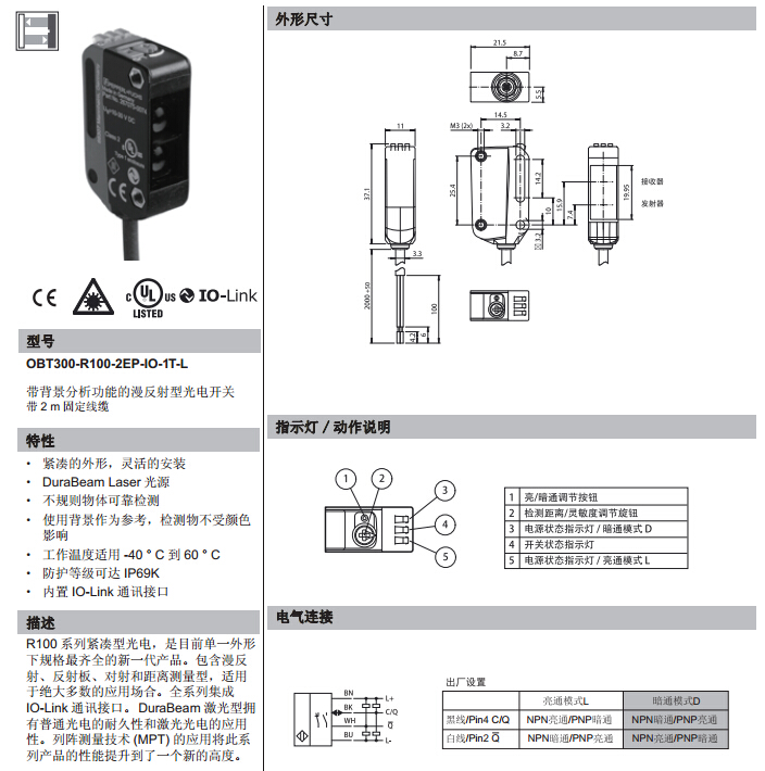 OBT300-R100-2EP-IO-1T-L,漫反射型傳感器