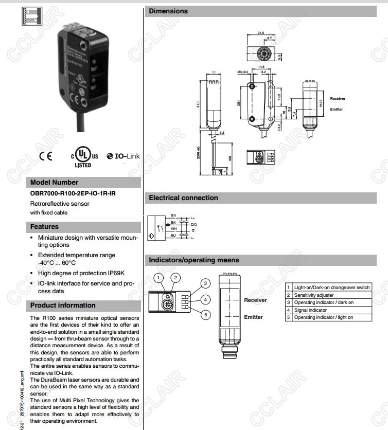 OBR7000-R100-2EP-IO-1R-IR,反射板型傳感器