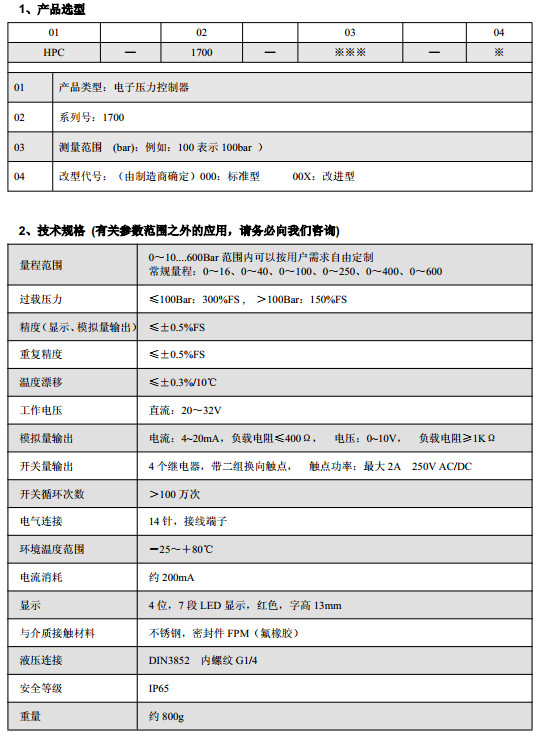 HPC-1700-16,HCP-1700-40,HCP-1700-100,HCP-1700-250,HCP-1700-400,HCP-1700-600智能電子壓力控制器