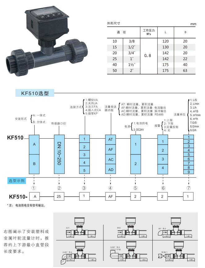 KF510-A-10,KF510-A-15,KF510-A-20,KF510-A-25,KF510-A-40,KF510-A-50,KP插管連接葉輪流量計