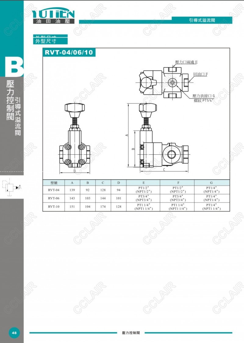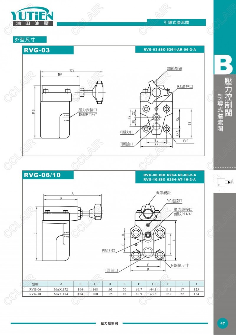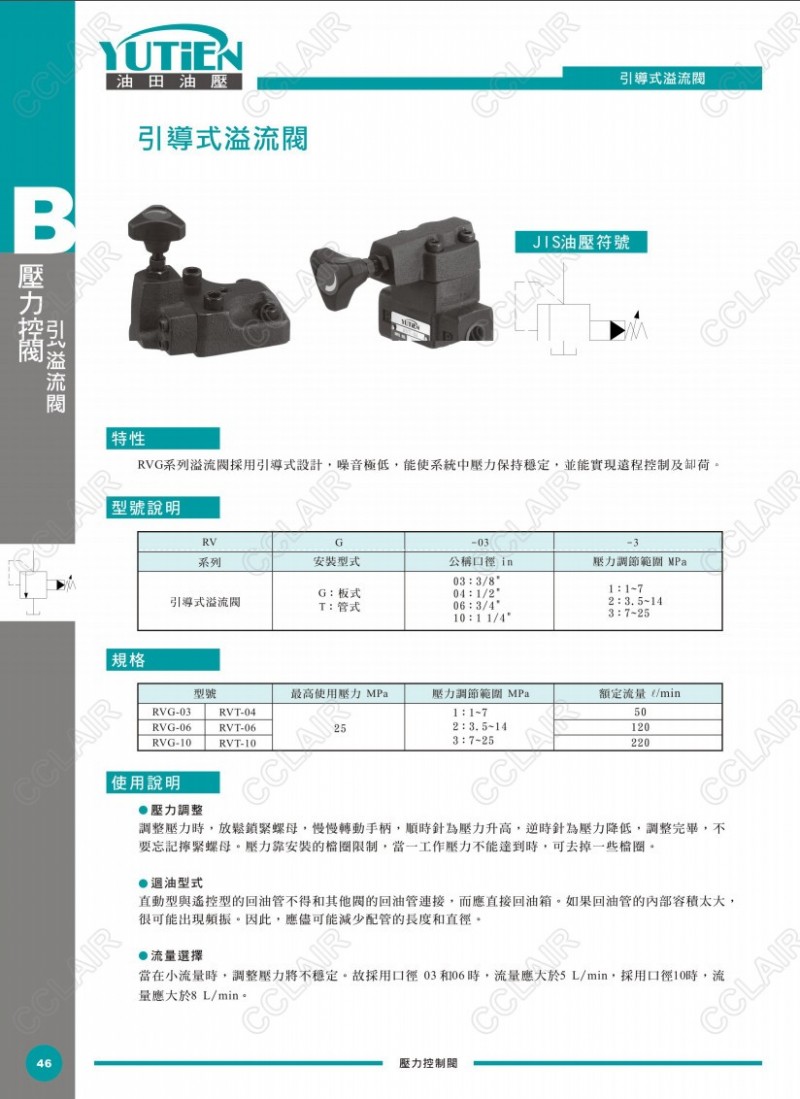 YUTIEN油田引導式溢流閥RVG-03-1,RVG-06-2,RVG-10-3,RVT-04-1,RVT-06-2,RVT-10-3
