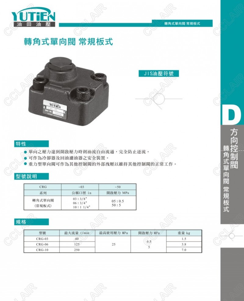 YUTIEN油田轉(zhuǎn)角式單向閥CRG-03-05,CRG-03-50,CRG-06-05,CRG-06-50,CRG-10-05,CRG-10-50