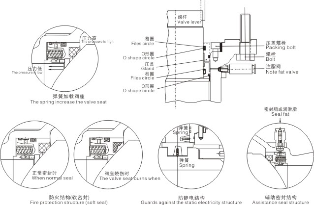 8、耐火結(jié)構(gòu)雙重保護(hù),當(dāng)萬一發(fā)生火災(zāi)而使密封圈燒損時(shí),球閥的各個(gè)密封部位均能形成金屬對金屬的硬密封結(jié)構(gòu)。