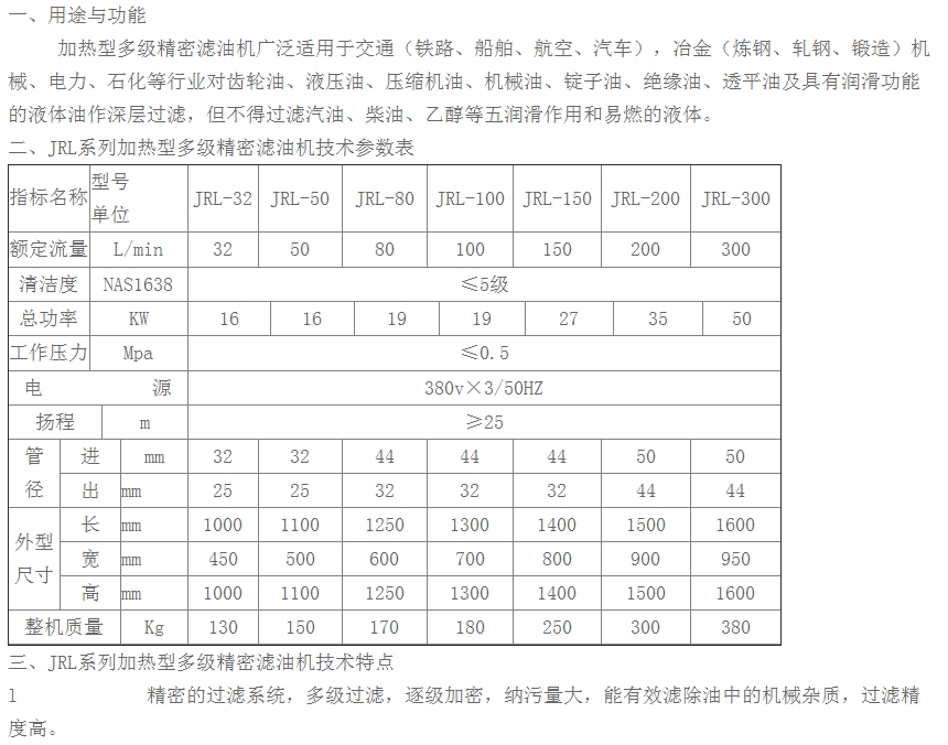 JRL-32,JRL-50,JRL-80,JRL-100,JRL-150,JRL-200,JRL-300,加熱型多級(jí)精密濾油機(jī)