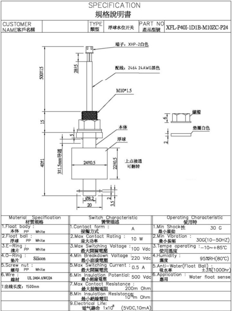 XFL-P40I-D1,40mm超短浮球開(kāi)關(guān)