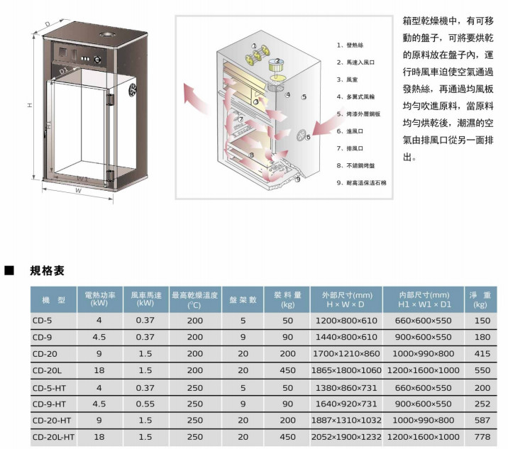 CD-5,CD-9,CD-20,CD20L,CD-5-HT,CD-9-HT,CD-20-HT,CD-20L-HT,箱型干燥機