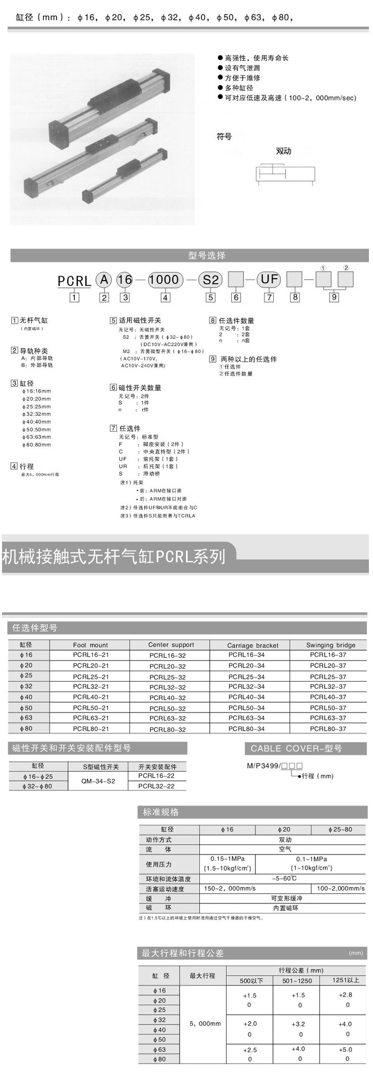 PCRLA16,PCRLA20,PCRLA25,PCRLA32,PCRLA40,PCRLA50,PCRLA63,PCRLA80,無桿氣缸PCRL