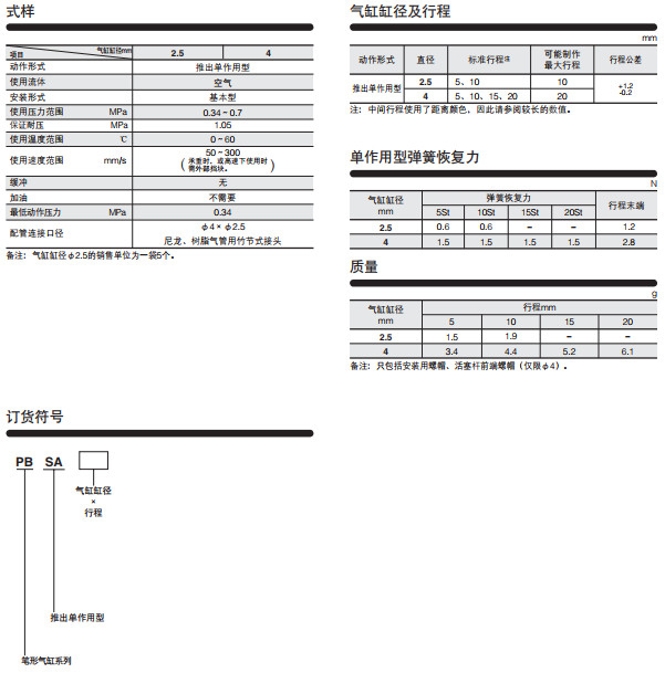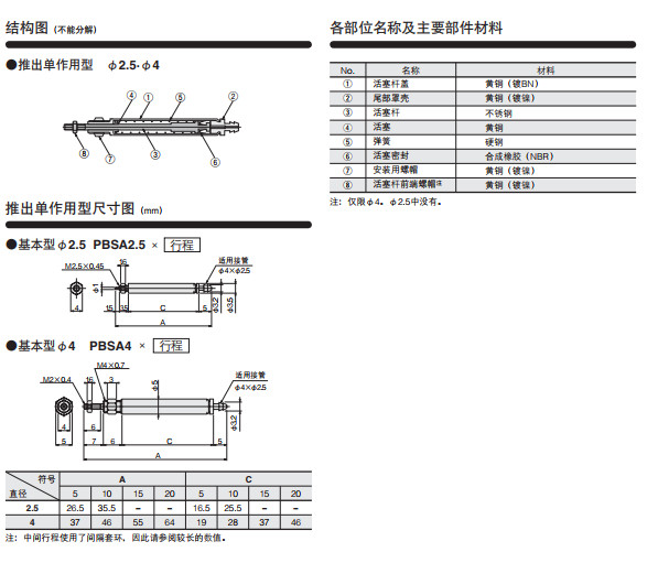 PBSA2.5*5,PBSA2.5*10,PBSA4*5,PBSA4*10,PBSA4*15,PBSA4*20,筆形氣缸--推出單作用型