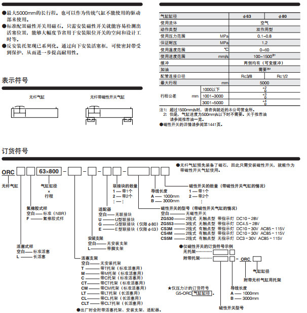 ORC63*500,ORC63*600,ORC63*700,ORC63*800,ORC63*1000,ORC63*1200,開口式無(wú)桿氣缸