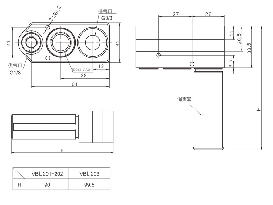 | 規(guī)格 | 供氣口 | 真空口 | 排氣口 |