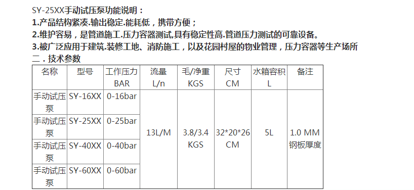 手動管道試壓泵SY-16XX,SY-25XX,SY-40XX,SY-60XX