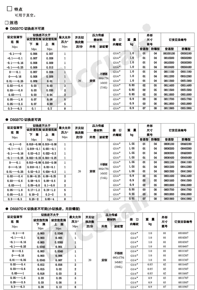 0800100,0801500,0800200,0801600,壓力控制器 普通 D502/7D切換差可調(diào) 0800300,0801700,0800400,0801800, 0801100,0801200,0801300,0801400,