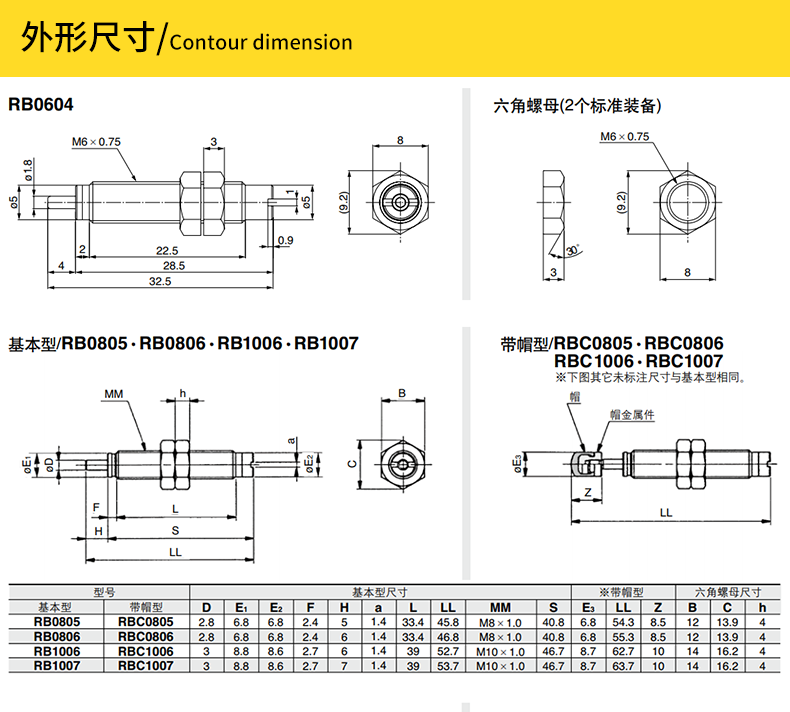 RB0604,RB0805,RB0806,RB1006,RB1007,RB1210,RB1411,RB1412,RB2015,RB2725,RB不帶帽緩沖器