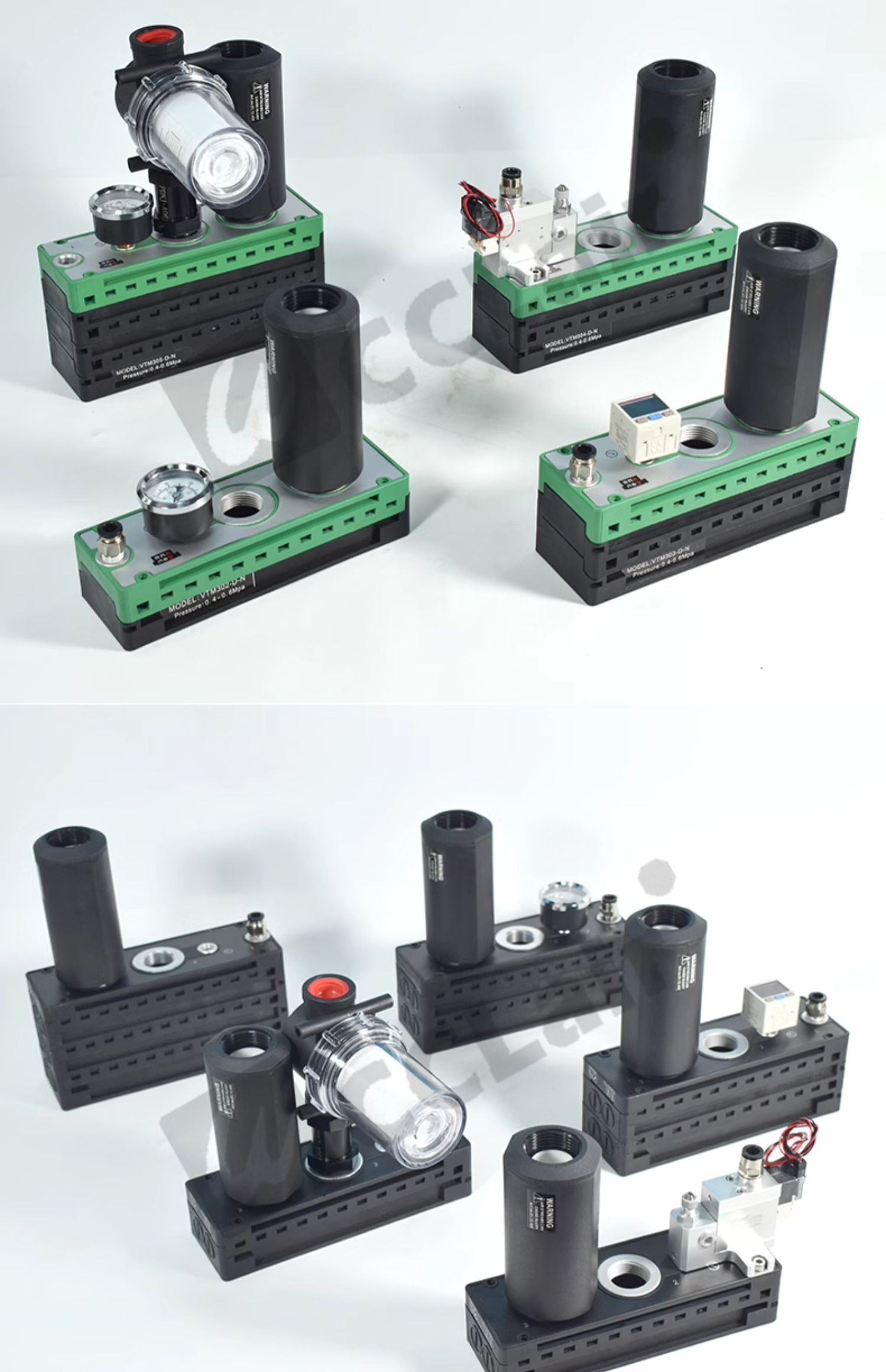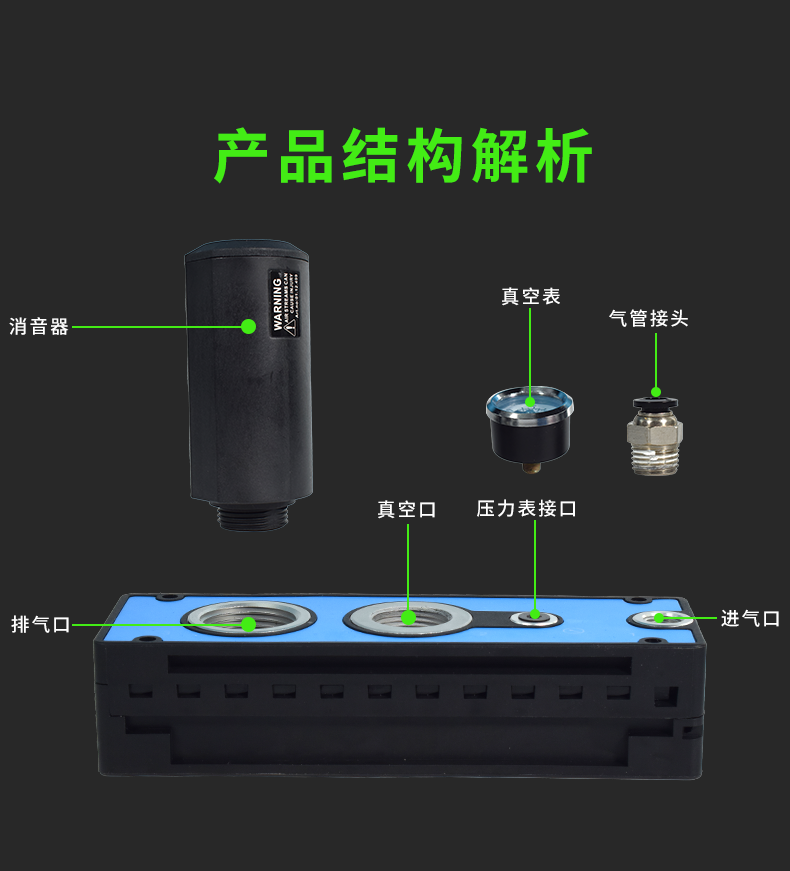 真空發(fā)生器的工作原理主要依賴于拉瓦爾噴管、?負(fù)壓腔和接口管等組件。?氣流從供氣口進(jìn)入,?經(jīng)過噴管射出,?形成高速射流。?由于氣體的黏性,?高速射流會(huì)吸走負(fù)壓腔內(nèi)的氣體,?從而在該腔內(nèi)形成真空。