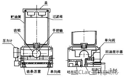 | 手動(dòng)潤(rùn)滑泵是借人工擺動(dòng)手把,通過齒輪帶動(dòng)齒條活塞往復(fù)運(yùn)動(dòng)實(shí)現(xiàn)向外供油的,當(dāng)活塞處于圖示極限位置時(shí),潤(rùn)滑脂通過吸入口吸入并充滿活塞的右腔,當(dāng)活塞向右移動(dòng)時(shí),被吸入的潤(rùn)滑脂在油壓的作用下頂開單向閥壓送至出口向外排出,當(dāng)系統(tǒng)中主分配器的一計(jì)量油口返回至回油指示器的油量達(dá)到3.2mL時(shí),指示桿全部伸出,證明系統(tǒng)所有潤(rùn)滑點(diǎn)已得到所需的潤(rùn)滑油量,此時(shí)停止操作手把并把指示桿向內(nèi)壓進(jìn),為下循環(huán)準(zhǔn)備,指示器內(nèi)的潤(rùn)滑脂經(jīng)單向閥返回貯油桶內(nèi)。 |