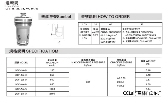 LCV-16, LCV-25, LCV-32, LCV-40, LCV-50, LCV-63,邏輯閥