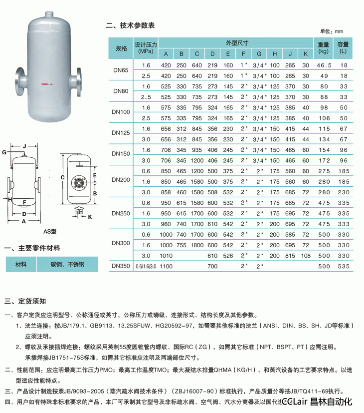 AS-PN1.6-DN65,AS-PN1.6-DN80,AS-PN1.6-DN100,AS-PN1.6-DN125,汽水分離器 |