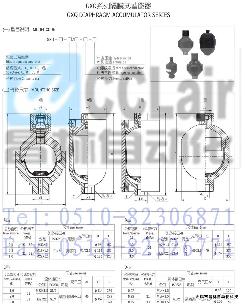 GXQ-D-0.07/33-L-Y,GXQ-D-0.07/33-L-R,GXQ-D-0.07/33-F-Y,GXQ-D-0.07/33-F-R,隔膜式蓄能器