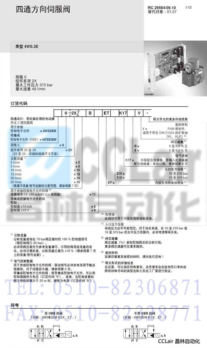 4WS2EM6-2X/10B11ET210K17EV,4WS2EM6-2X/10B11ET315K17DV, 方向伺服閥,力士樂REXROTH,德國力士樂 |