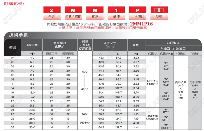 備注:1、假設您所要的前泵排量是16.0ml/rev,正確的訂購型號:2MM1P16。