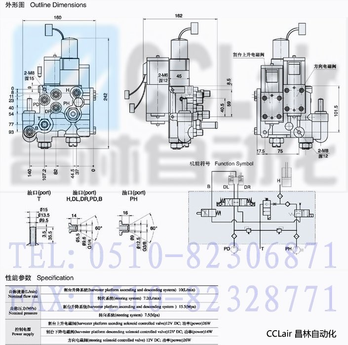 HCS6-12V電磁控制閥由方向電磁閥、割臺上升電磁閥和割臺下降電磁閥集成在閥體上構(gòu)成的。方向電磁閥的電磁鐵采用了單端