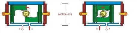 氣缸兩端氣腔的空氣通過(guò)B孔排出,同時(shí)中心軸便逆時(shí)針?lè)较蛐D(zhuǎn)90°,