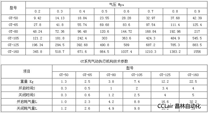 GT系列氣動(dòng)執(zhí)行機(jī)構(gòu)輸出扭矩表 單位:NM