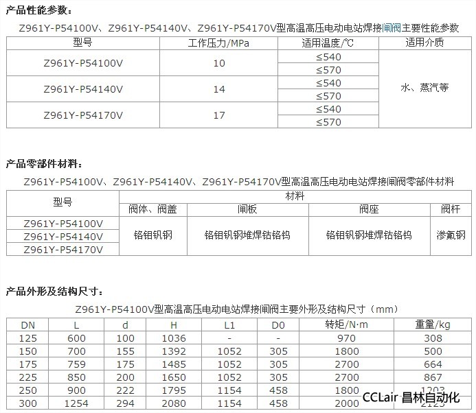 產(chǎn)品說明: Z961Y-P54100V、Z961Y-P54140V、Z961Y-P54170V型高溫高壓電動(dòng)電站焊接閘閥驅(qū)動(dòng)方式為電動(dòng),連接方式為對(duì)接焊連接形式,閥門為明桿楔式剛性單閘板,閥座密封面材料為鉻鉬釩鋼堆焊鈷鉻鎢合金,工作壓力10MPa~17MPa,閥體材料為鉻鉬釩鋼的高溫高壓電站閘閥。