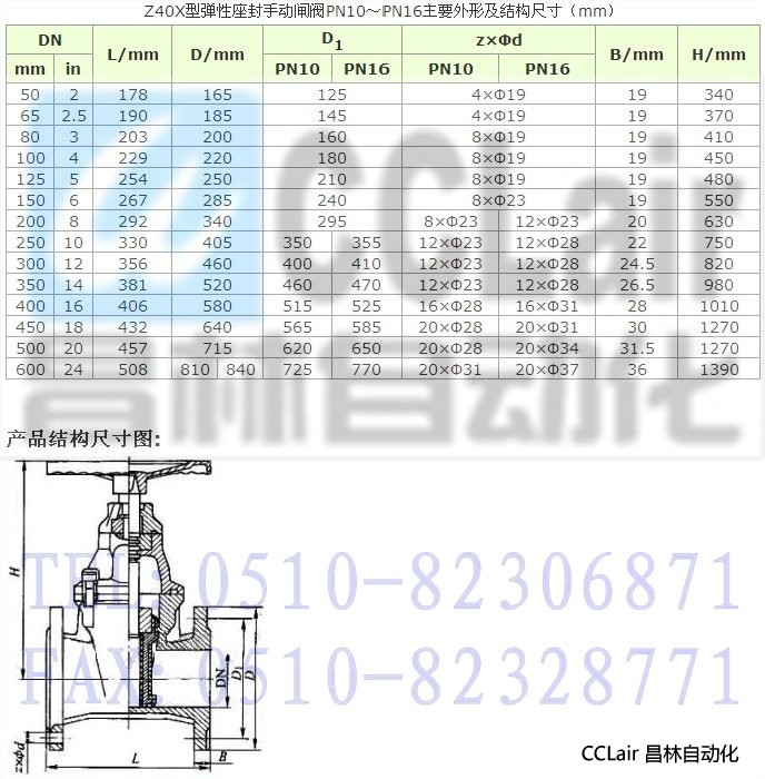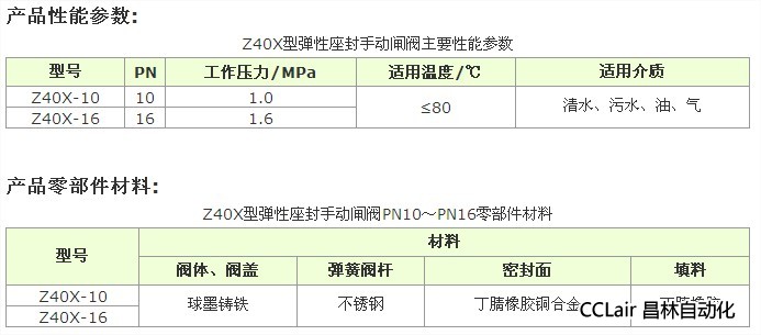 Z40X型彈性座封閘閥:手動(dòng)、法蘭連接、明桿楔式彈性閘板,閥座密封面材料為丁腈橡膠銅合金,公稱壓力 PN10~PN16,閥體材料為球墨鑄鐵的彈性座封閘閥。