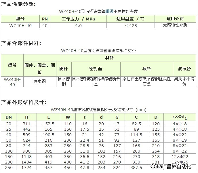 產(chǎn)品說明 WZ40H-40 型波紋管閘閥:手動驅(qū)動、法蘭式連接、明桿楔式彈性閘板結(jié)構(gòu),閥座密封面材料為不銹鋼、公稱壓力 PN40、閥體材料為碳素鋼的波紋管閘閥。紋管閘閥的閥桿采用波紋管及填料雙重密封結(jié)構(gòu),確保閥桿處的無泄漏密封,應(yīng)用于電站、天然氣、氨、真空、冷凍系統(tǒng)、熱油、熱水系統(tǒng),特別適用于易燃、易爆、有毒及貴重介質(zhì)的管路。