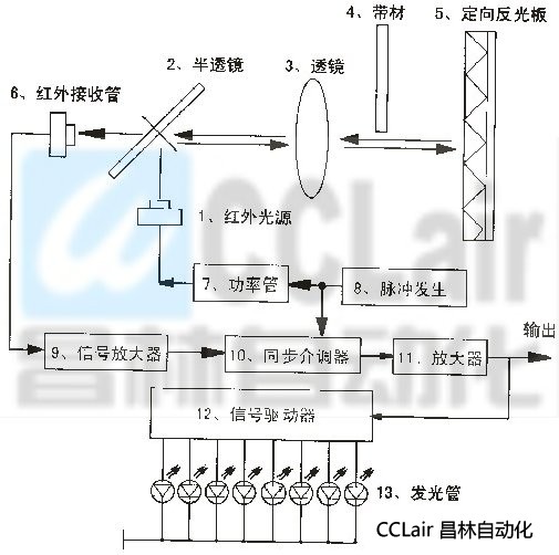 原理框圖見(jiàn)下圖,紅外光源(1)發(fā)出高頻光脈沖,通過(guò)半透鏡(2)透鏡(3)射出一束平行光,經(jīng)定向反光板(5)反射后沿原路返回到傳感器內(nèi),由紅外光敏接收管(6)接收并經(jīng)過(guò)信號(hào)放大器(9)轉(zhuǎn)變成電脈沖信號(hào)。當(dāng)光路上有帶材(4)遮擋時(shí),光信號(hào)的強(qiáng)弱便發(fā)生變化,這個(gè)變化經(jīng)同步介調(diào)和放大后,變成電壓/電流標(biāo)準(zhǔn)信號(hào)輸出。