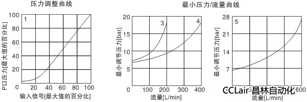 注:1=流量在50L/min時(shí)測(cè)得的壓力調(diào)整曲線;在0輸入信號(hào)時(shí)閥的最小壓力流量曲線;3=03系列閥、4=06系列閥、05=08系列閥。