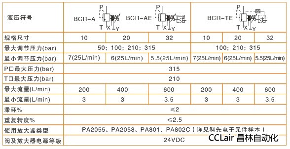 BCR是錐閥型先導(dǎo)式比例溢流閥,閥的壓力與輸入電信號(hào)成正比。此類(lèi)閥工作時(shí)是通過(guò)電子放大器提供比例電磁鐵的驅(qū)動(dòng)電流,調(diào)整閥的工作壓力。