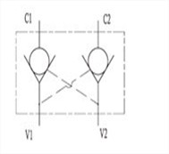 此閥使用時,C1口到V1口和C2口到V2均不通。 當V1口或V2口有足夠壓力時,C2到V2通,或C1到V1通。此閥比例比為2.5:1,即V1口或V2口壓力達到C1口或C2口負載壓力的1/2.5時,允許液流從C2口到V2口或從C1到V1流動。