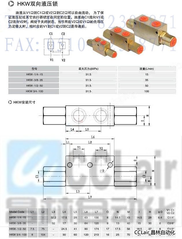 HKW-1/4-15, HKW-3/8-35, HKW-1/2-50, HKW-3/4-100, 雙向液壓鎖