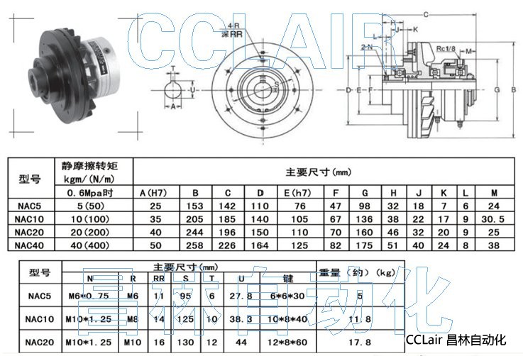 NAC6,NAC10,NAC20,NAC40,(標(biāo)準(zhǔn)型)空壓通軸式離合器