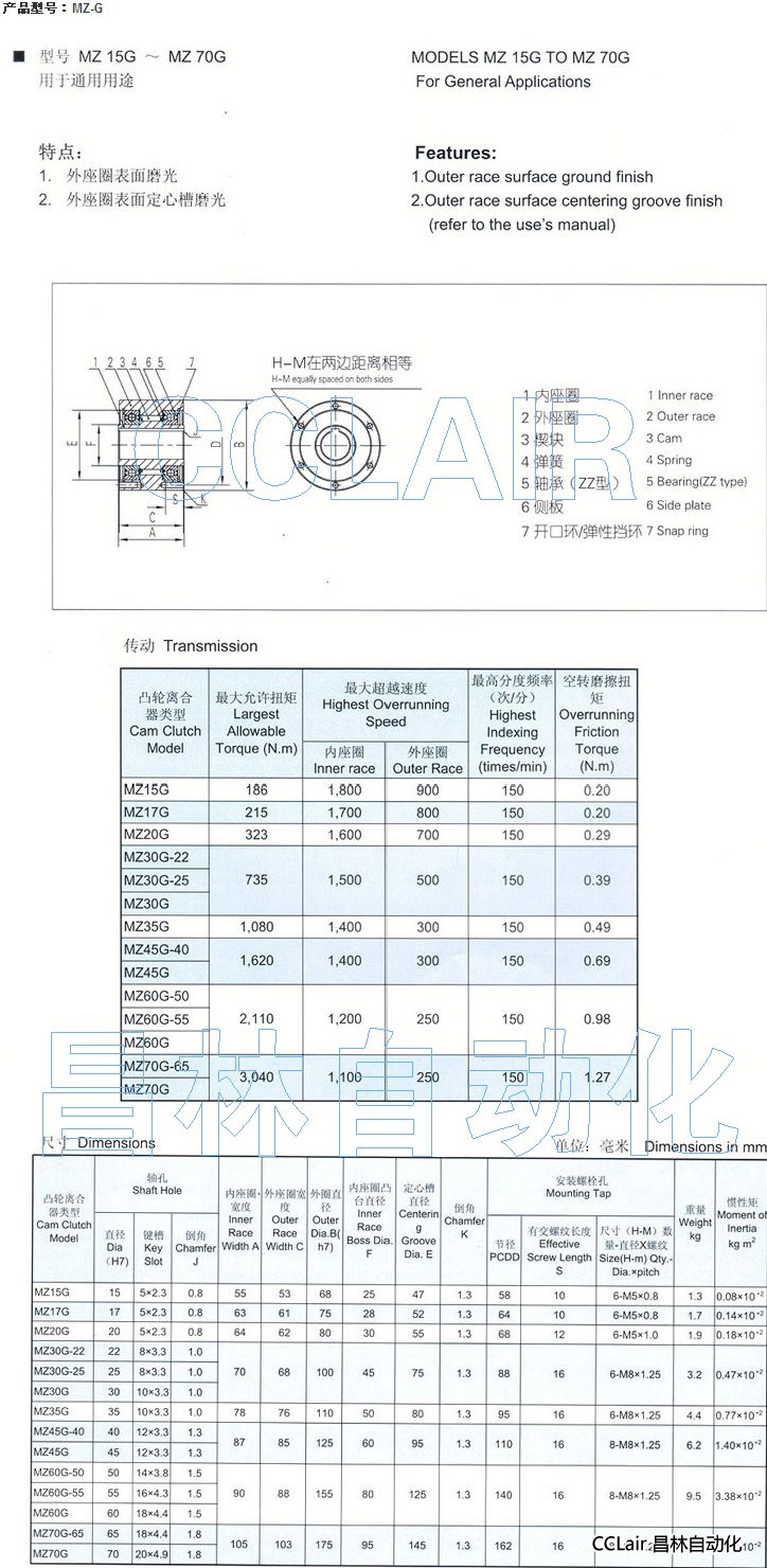 MZ15G,MZ17G,MZ20G,MZ30G-22,MZ30G-25,MZ30G,MZ35G,MZ45G-40,MZ45G,MZ60G-50,凸輪離合器