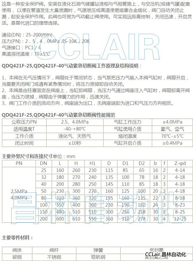 QDQ421F-25-DN25,QDQ421F-25-DN32,QDQ421F-40-DN25,氣動緊急切斷閥