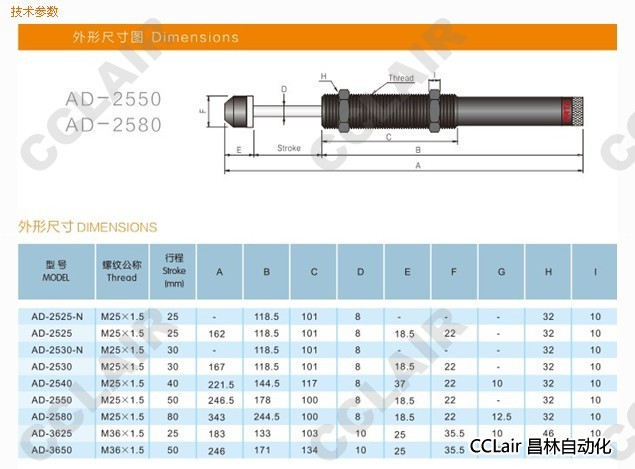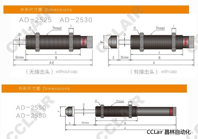 AD25/AD36系列 可調(diào)整式緩沖器 AD25、AD36 1、0-270度單邊偏心調(diào)整,有效增大調(diào)整范圍 2、有單孔阻尼式結構(-5系列)及多孔緩沖式結構,可根據(jù)要求選擇 3、外壓缸全螺紋,可靈活安裝調(diào)整 4、專用密封裝置及特殊液壓油組合,提高緩沖性能及使用壽命