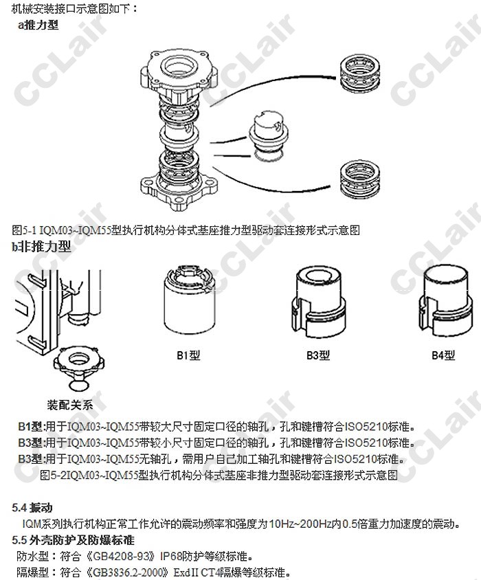 圖5-1、圖5-2。執(zhí)行機構(gòu)的安裝見圖5-3、圖5-4。在IQM03~IQM55型號中,由于對推力型驅(qū)動部件的改進,已不再區(qū)分A型與Z型,統(tǒng)