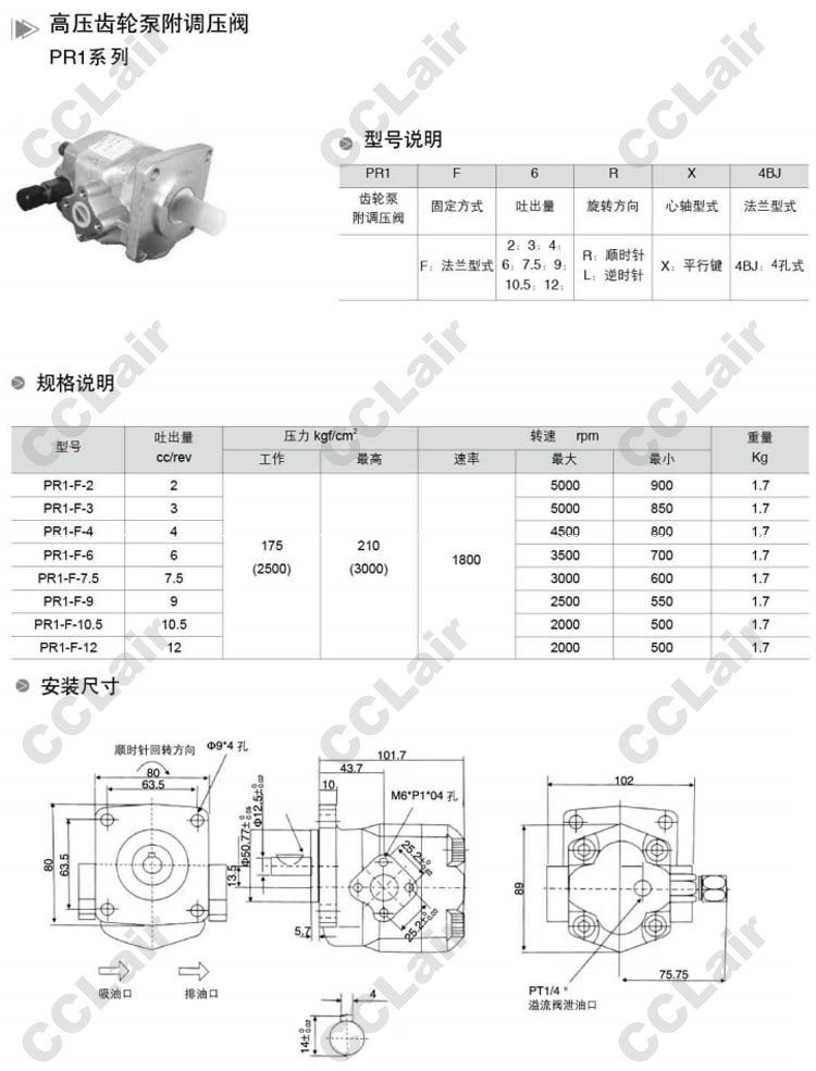 PR1-F-2RX-4BJ,PR1-F-3RX-4BJ,PR1-F-4RX-4BJ,PR1-F-6RX-4BJ,PR1-F-7.5RX-4BJ,高壓齒輪泵附調壓閥