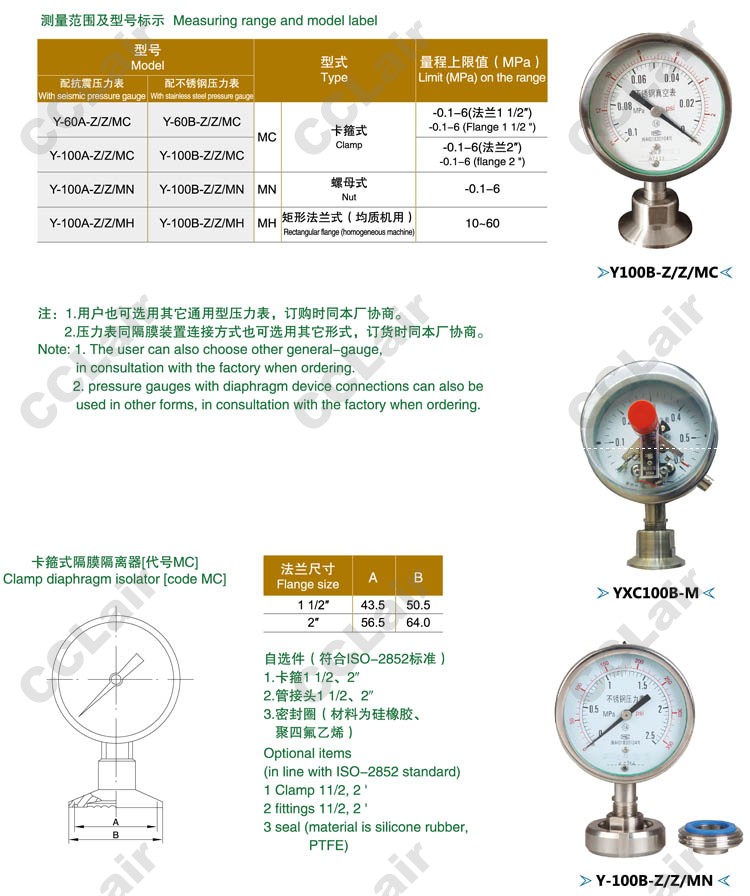 Y-60A-Z/ZMC,Y-100A-Z/ZMC,Y-100A-Z/ZMN,Y-100A-Z/ZMH,衛(wèi)生型隔膜壓力表,無(wú)錫昌林
