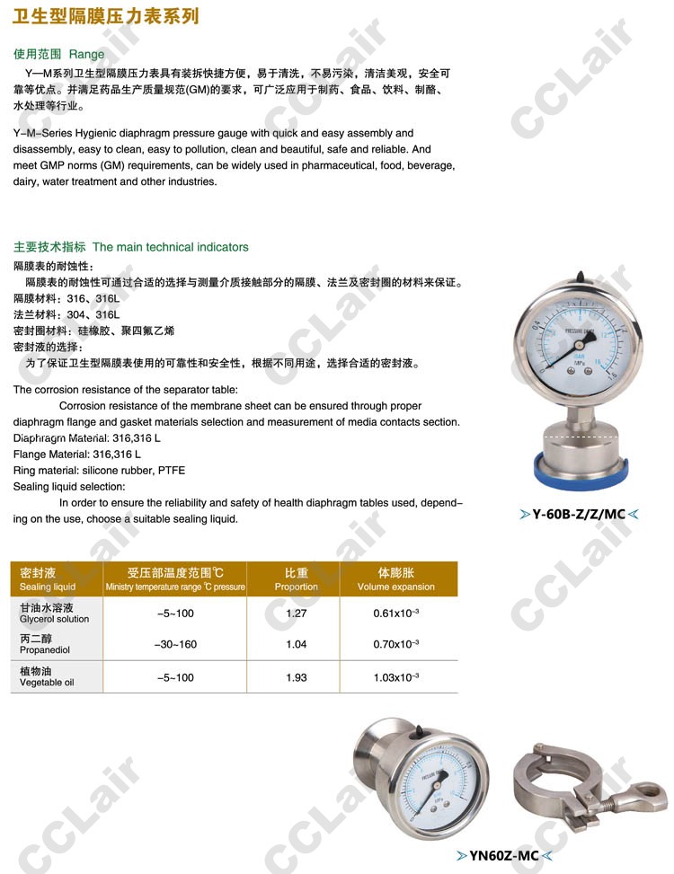 Y-60A-Z/ZMC,Y-100A-Z/ZMC,Y-100A-Z/ZMN,Y-100A-Z/ZMH,衛(wèi)生型隔膜壓力表
