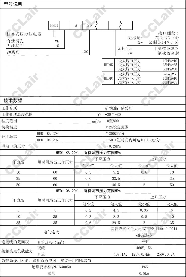 HED1KA20/10,HED1KA20/35,HED1KA20/50,HED10A20/5,HED10A20/10,HED10A20/35,壓力繼電器