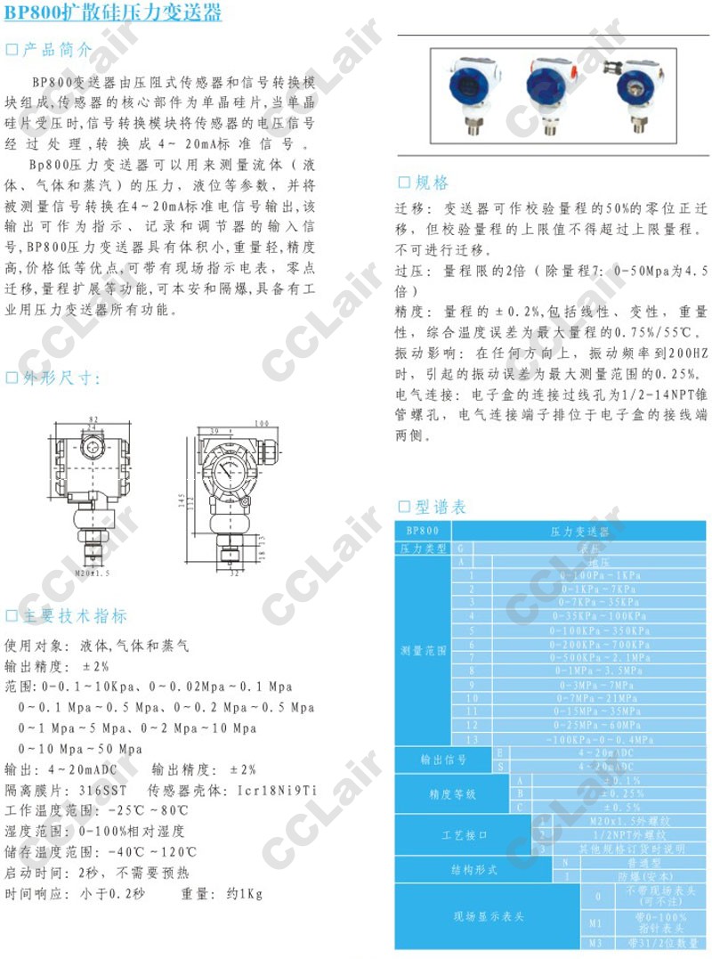 BP800,擴(kuò)散硅壓力變送器,CCLair