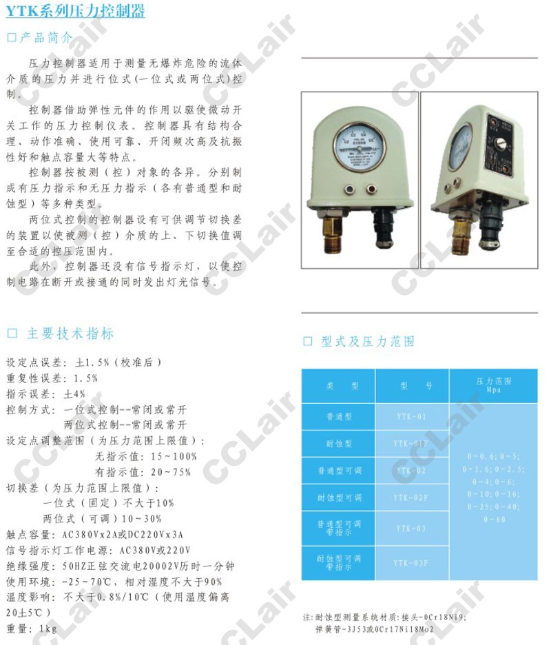YTK-01,YTK-01F,YTK-02,YTK-02F,YTK-03,YTK-03F,壓力控制器,CCLair