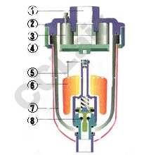 空壓系統(tǒng)的壓縮空氣與水份由上方的入水口進(jìn)入排水器,污垢與銹渣被過濾積存在過濾網(wǎng)內(nèi),壓縮空氣經(jīng)由底部的第二層過濾網(wǎng)進(jìn)入控制器內(nèi)部,將活塞推高,關(guān)閉排水口,水份經(jīng)由上部過濾網(wǎng)流入下部集水罩內(nèi)積存,水位逐漸昇高到浮球的一半,浮球上昇帶動(dòng)控制器頂端的進(jìn)氣塞,壓縮空氣進(jìn)入控制器內(nèi)部上方,將活塞推壓打開排水口,使水份強(qiáng)制排出,浮球下降後進(jìn)氣塞關(guān)閉,使壓縮空氣不能進(jìn)入控制器內(nèi),殘留的壓縮空氣經(jīng)由活塞中央的小孔排出,活塞下方的壓縮空氣再推高活塞,同時(shí)關(guān)閉底端的排水閥門。