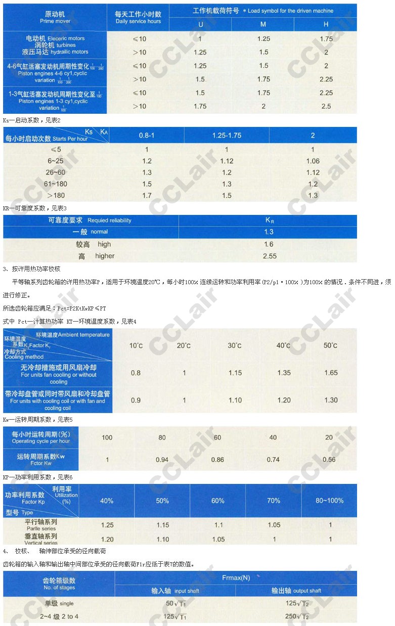 平等軸系列齒輪箱的公稱輸入功率PA(表9—20)按載荷平穩(wěn),每天工作時間小于或等于10h,每小時啟動不超過5次,允許啟動轉(zhuǎn)矩為工作轉(zhuǎn)矩的2倍,單向運轉(zhuǎn),單對齒輪的接觸強(qiáng)度安全系數(shù)約為1,失效率概率小于或等于1%等條件計算確定的。齒輪箱雙向運轉(zhuǎn)時,需視情況將PN乘上0.8—1.0的系數(shù),當(dāng)反向載荷大,換向頻繁、選用的可靠度系數(shù)KR較低時,系數(shù)取較小值,反之取較大值。