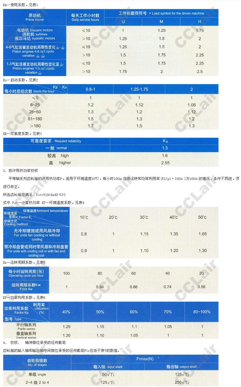 平等軸系列齒輪箱的公稱輸入功率PA(表9—20)按載荷平穩(wěn),每天工作時間小于或等于10h,每小時啟動不超過5次,允許啟動轉(zhuǎn)矩為工作轉(zhuǎn)矩的2倍,單向運轉(zhuǎn),單對齒輪的接觸強度安全系數(shù)約為1,失效率概率小于或等于1%等條件計算確定的。齒輪箱雙向運轉(zhuǎn)時,需視情況將PN乘上0.8—1.0的系數(shù),當反向載荷大,換向頻繁、選用的可靠度系數(shù)KR較低時,系數(shù)取較小值,反之取較大值。