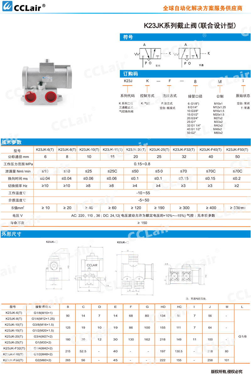 K23JK-6,K23JK-8,K23JK-10,K23JK-15,K23JK-F32,K23JK-15T,K23JK-F40,K23JK-F50T,二位三通截止式氣控換向閥
